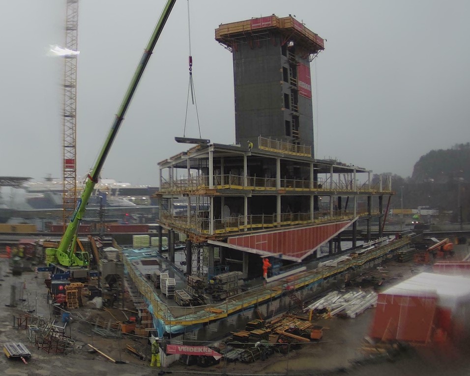 Det er brukt ca. 225 tonn stål i hele bygget, hovedsakelig konstruksjonsstål med kvalitet S355 i en kombinasjon av resirkulert og nyprodusert stål som underbygger kravene til Breeam-sertifisering. Utkragingen strekker seg 8,7 meter. For å kunne stabilisere utkragingen er det lagt fagverk i tredje og fjerde etasje som fungerer som byggets bærebjelke. Senior Prosjektleder MRIF Kjetil Norby fra Sweco forklarer at bygget har en krevende geometri i og med at krefter fra vind, skjevstilling og jordskjelvlaster måtte tas opp av trappe/heiskjernen. Bruk av stål gjør det enklere å overføre store skivekrefter inn i denne kjernen. – Det handler om hvordan man overfører horisontale laster ned til bakken. De vertikale lastene går via søyler og dragere ned til fundamenter på peler, mens de horisontale kreftene, som kommer primært av vindlast, bæres av trapperommet. Man kan se på det som at trapp og heisrom er en søyle som skal overføre alle disse lastene ned. Grensesnitt og kobling mellom sjakten, samt overføring av kreftene inn til sjakten, er vanskelig å løse uten å bruke stål, da vi trenger styrken kombinert med slankhet, forklarer Kjetil Norby. Watkins fremhever at stål har den fordelen at man kan få mer ut av takhøyden ved å bruke slanke stålprofiler.