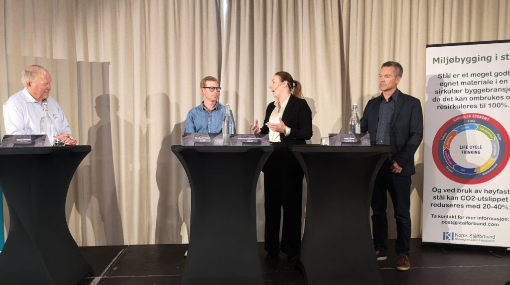 Fra venstre ordstyrer Göran Persson og industripanelet ved Sondre Smeland (Teknisk sjef, SSAB), Susanne M. Nævermo-Sand (Head of Sustainability and Strategy, CELSA Nordic) og Vetle Houg (Adm. dir. Heidelberg Materials Sement)