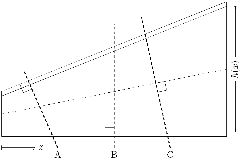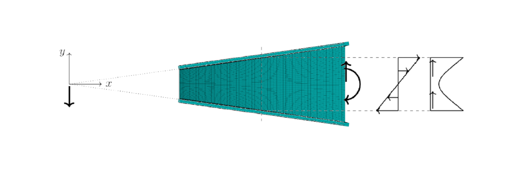 Etter vanlig bjelketeori for uniforme bjelker er som kjent normalspenningene fra moment og aksialkraft rettet parallelt til bjelkens akse gjennom tyngdepunktet. Bjelkens skjærkraft forutsettes tatt av skjærspenningene i bjelkens steg. For bjelker med varierende steghøyde derimot står flensene skråstilte (Figur 2) i forhold til bjelkeaksen, og normalspenningene i bjelkeflensene og i stegplaten blir tilsvarende skråstilte. Skrå flenskrefter har kraftkomponenter tvers på bjelkeaksen, noe som påvirker og samvirker med bjelketeoriens bøyeskjærspenninger. En ytterligere komplikasjon for bjelker med skrå flenser er at det heller ikke finnes noe «riktig» tverrsnitt man skal bruke, fordi en valgt snittlinje ikke samtidig kan skjære begge flensene og stegplaten i en rett vinkel (snitt A, B og C i Figur 2).