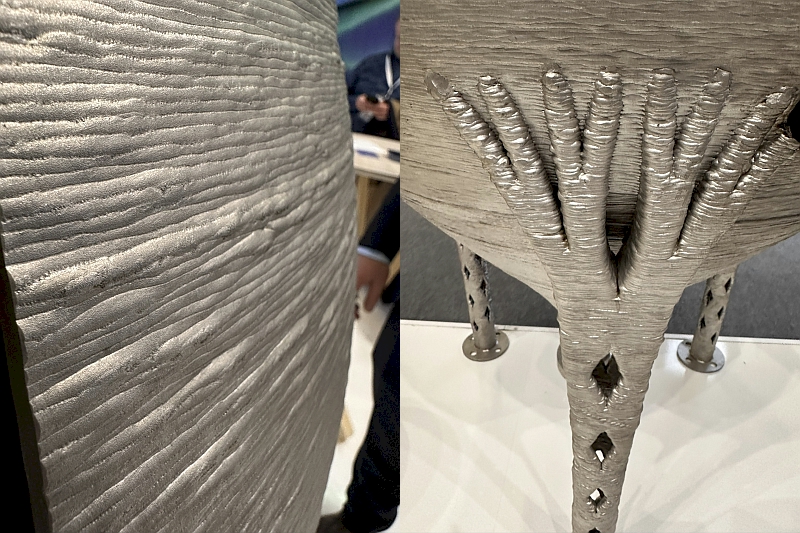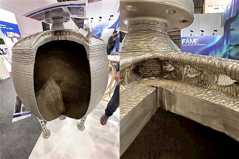 Første stopp var hos den skandinaviske paviljongen, hvor FAME (Finnish Additive Manufacturing Ecosystem) demonstrerte hvordan WAAM-teknologi muliggjør kostnadseffektiv og presis produksjon av store komponenter. Et trykktankeksempel laget av rustfritt stål med WAAM målte hele 900 mm i diameter og 1600 mm i høyde, med vekt på 300 kg.