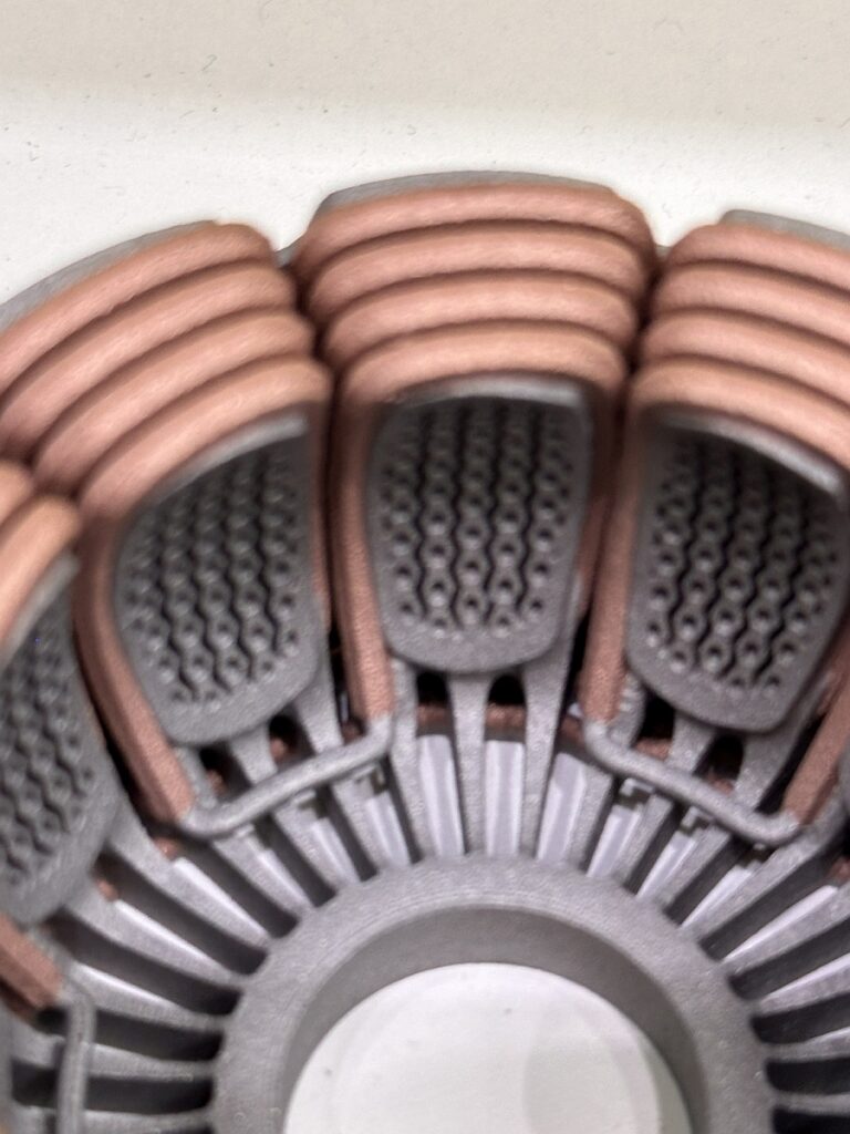 Detaljbilde av kobberledere-viklinger som er støttet opp av en 3D-printet ramme.