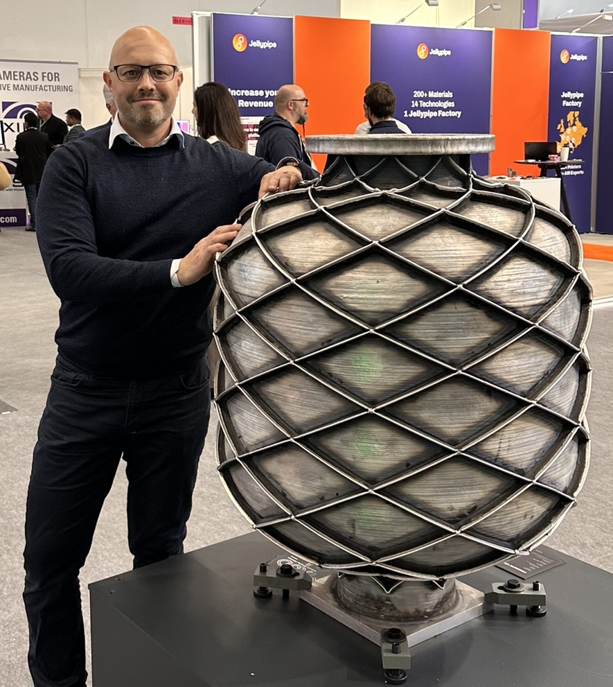 Artikkelforfatter siv.ing. Christian Wathne viser en trykktankt produsert med MX3D sin Wire Arc AM teknologi.